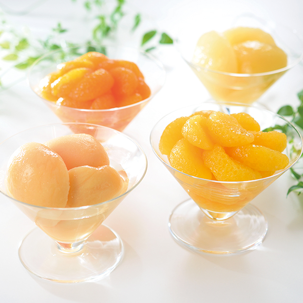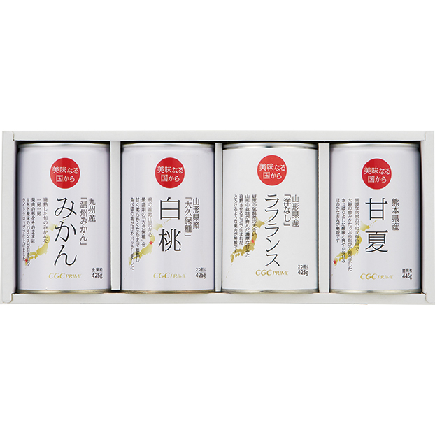 いちばん美味しい時季に国産果実を缶詰にしました。「みかん」「白桃」「ラフランス」「甘夏」の贅沢な4缶セットです。