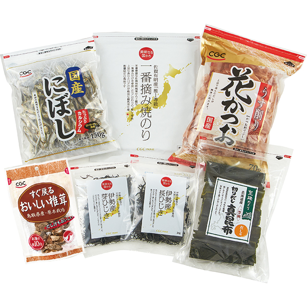 商品規格:一番摘み焼のり板のり10枚、国産にぼし150g、 花かつお70g、 芽ひじき24g、 長ひじき24g、荒磯だより切りだし真昆布(北海道産)一等検60g、すぐ戻るおいしい椎茸20g (段ボール箱入り)