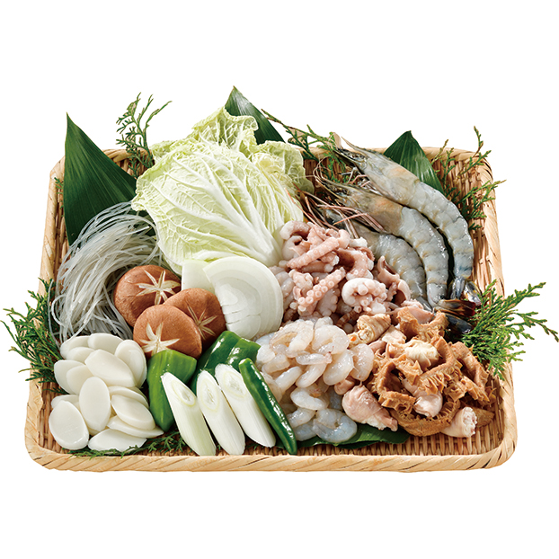 商品規格:もつ200g、ハチノス200g、ボイルエビ190g、エビ180g、タコ180g、春雨140g、餅100g、はくさい、ネギ、しいたけ、ニラ、ストレートスープ