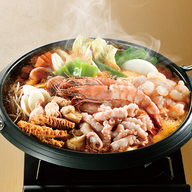 新大久保の人気韓国料理店「テーハンミング」の大人気メニュー。タコと、エビ・モツ・ハチノス・ボイルエビなどの新鮮な具材をたくさん盛り込んだピリ辛の鍋。加熱調理済みなので温めるだけで美味しく食べられます。