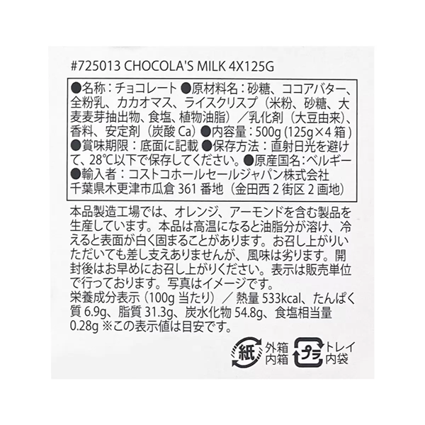 原材料名 | 砂糖、ココアバター、全粉乳、カカオマス、ライスクリスプ(米粉、砂糖、大麦麦芽抽出物、食塩、植物油脂)、乳化剤(大豆由来)、香料、安定剤(炭酸Ca ) |