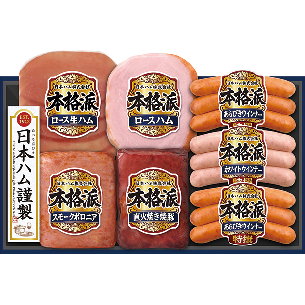 商品規格:ロースハム160g、スモークボロニア105g、ロース生ハム27g、直火焼き焼豚152g、特撰あらびきウインナー66g×2、特撰ホワイトウインナー66g