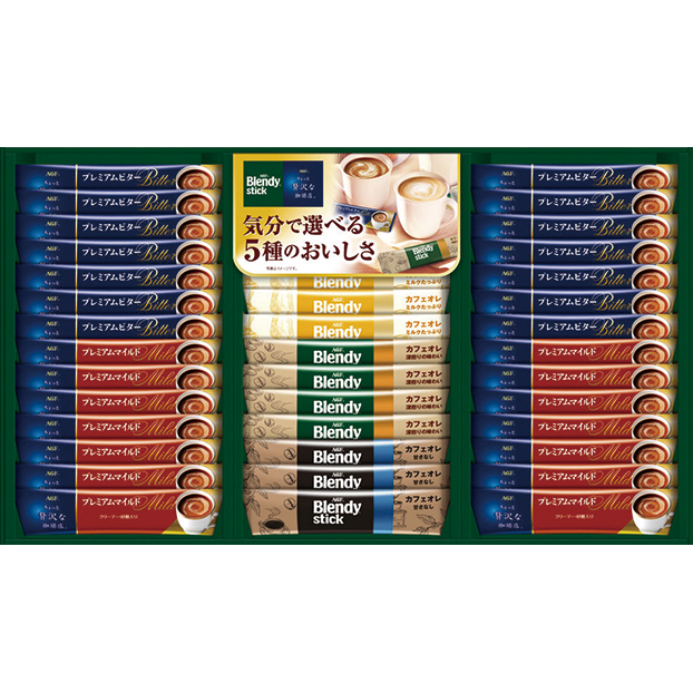 商品規格:ブレンディスティックカフェオレ14g×4、ブレンディスティックカフェオレ(ミルクたっぷり14g・甘さなし11.4g)×各3、ちょっと贅沢な珈琲店スティックコーヒー(プレミアムビター・プレミアムマイルド)各7g×各14