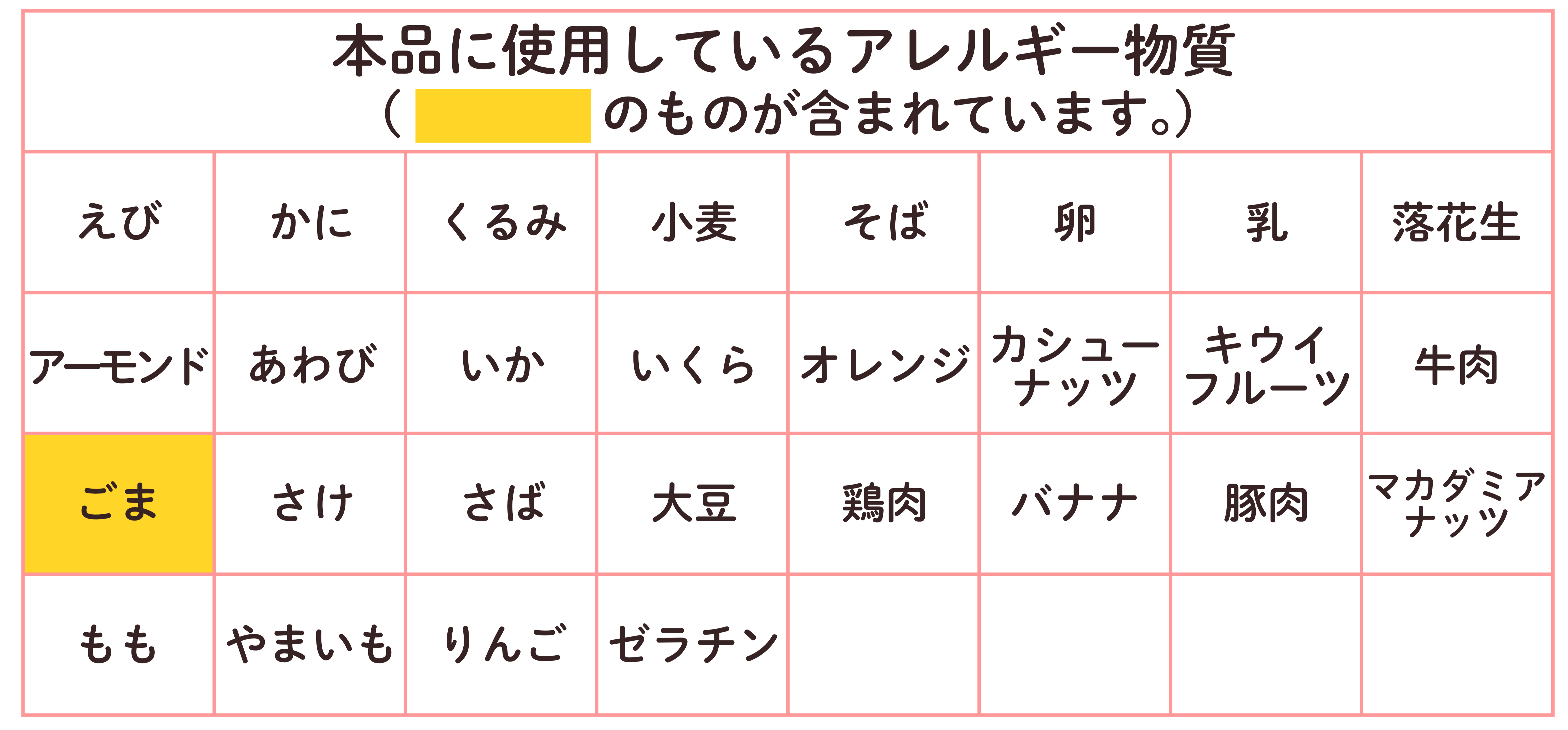 | 本製品に含まれるアレルギー物質(特定原材料、準特定原材料28品目中) | ごま |