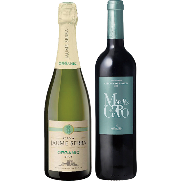 伝統的手法である瓶内2次発酵で造られる繊細な泡、柑橘系のアロマが楽しめる辛口のスペイン産オーガニックスパークリングワインと、カベルネソーヴィニヨンを主体に3年以上長期熟成させた「マルケス・デ・カロ」のセットです。