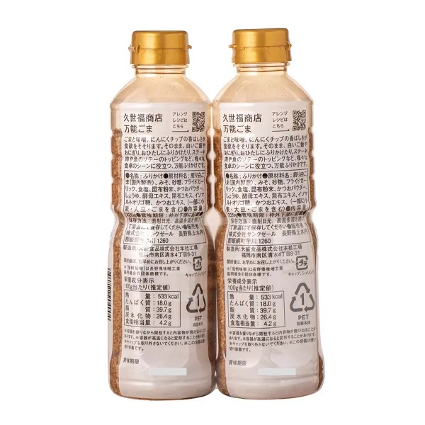 | 原材料名 | 煎り白ごま(国内製造)、みそ、砂糖、フライドガーリック、食塩、昆布粉末、かつおパウダー、しょうゆ、酵母エキス、昆布エキス、イソマルトオリゴ糖、かつおエキス、(一部に小麦・大豆・ごまを含む) |