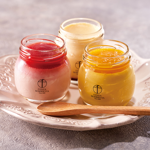 それぞれの素材の個性を考えフルーツソースをふんだんに使用。風味と味わい、なめらかな食感を楽しんでいただけるプリンです。