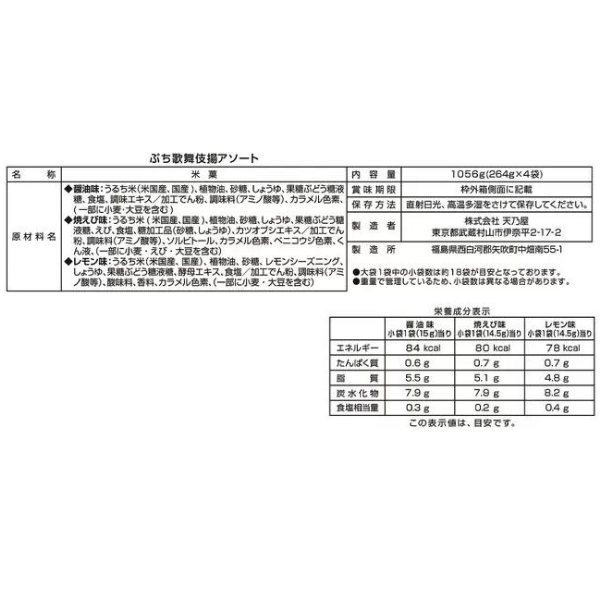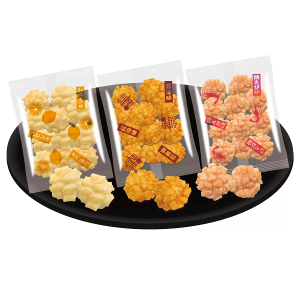 1960年発売のロングセラーブランド「歌舞伎揚」の、ぷちタイプのアソート商品です。「醤油味」「焼えび味」「レモン味」3種類の味わいが楽しめます。