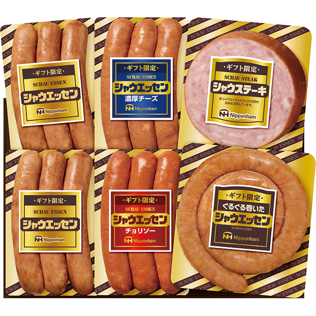 商品規格:(ギフト限定)シャウエッセン100g×2、シャウエッセン濃厚チーズ100g、シャウエッセンチョリソー100g、ぐるぐる巻いたシャウエッセン122g、シャウステーキ122g