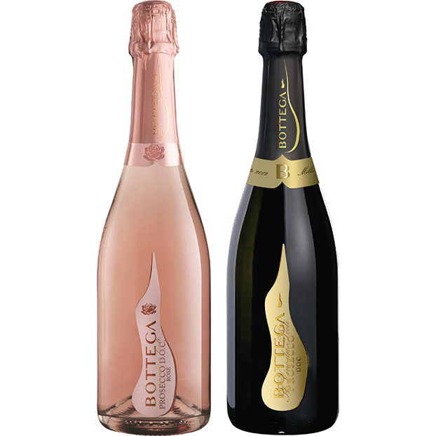 華やかなデザインボトルの先駆者「ボッテガ」。フルーティなスパークリ ングと、鮮やかな桜色のロゼスパークリングのセットです。