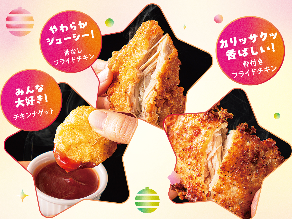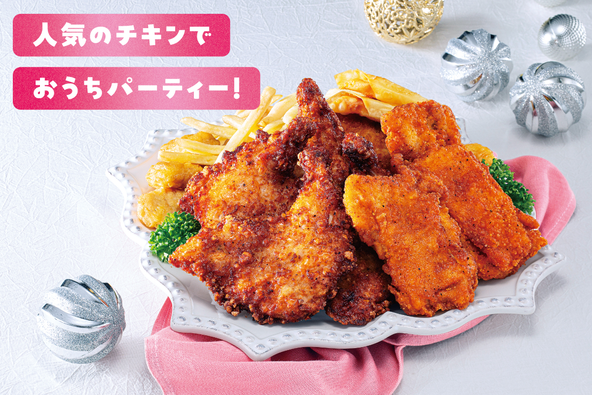 食べやすいもも肉の骨なしフライドチキン、ムネ肉を使用した可食部の多い骨付きフライドチキンを使用し家族で楽しめる様にチキンナゲット、ポテトを盛り込んだ家族で楽しめるフライドチキンセットです。