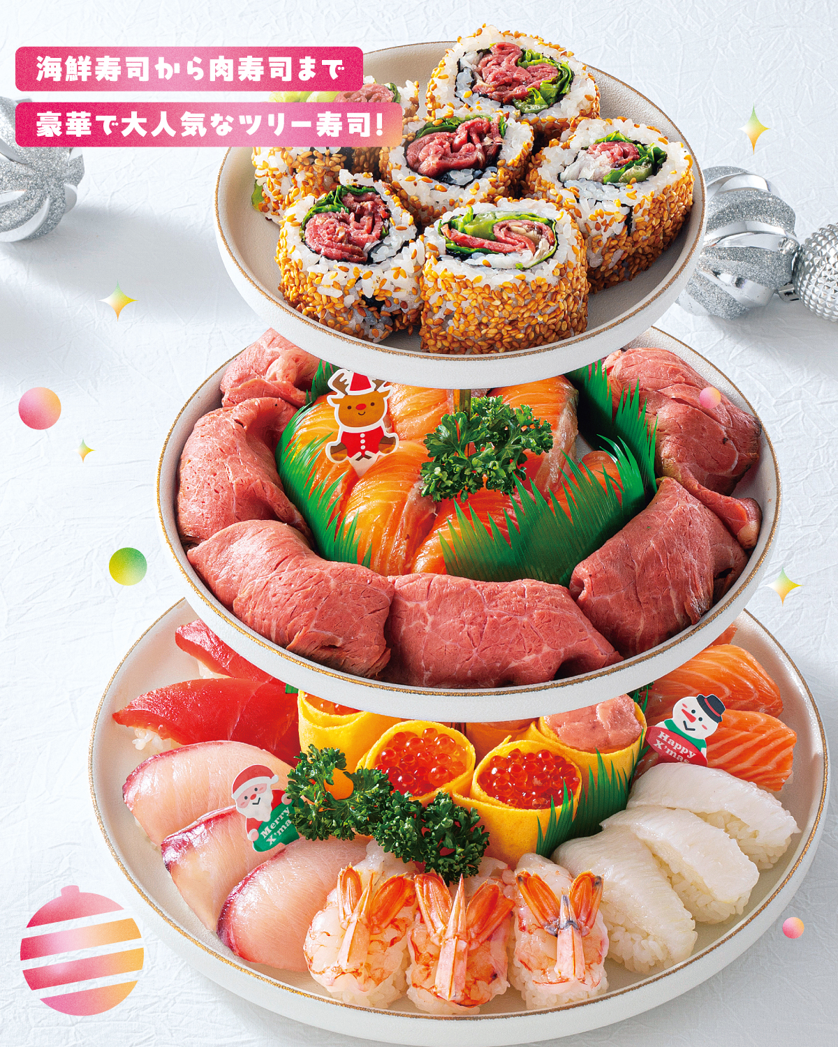 肉寿司から人気の海鮮寿司まで楽しめる、豪華なツリー寿司です。