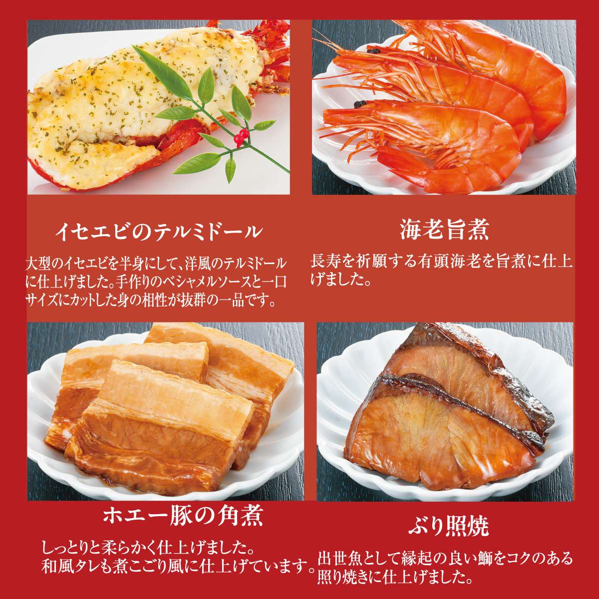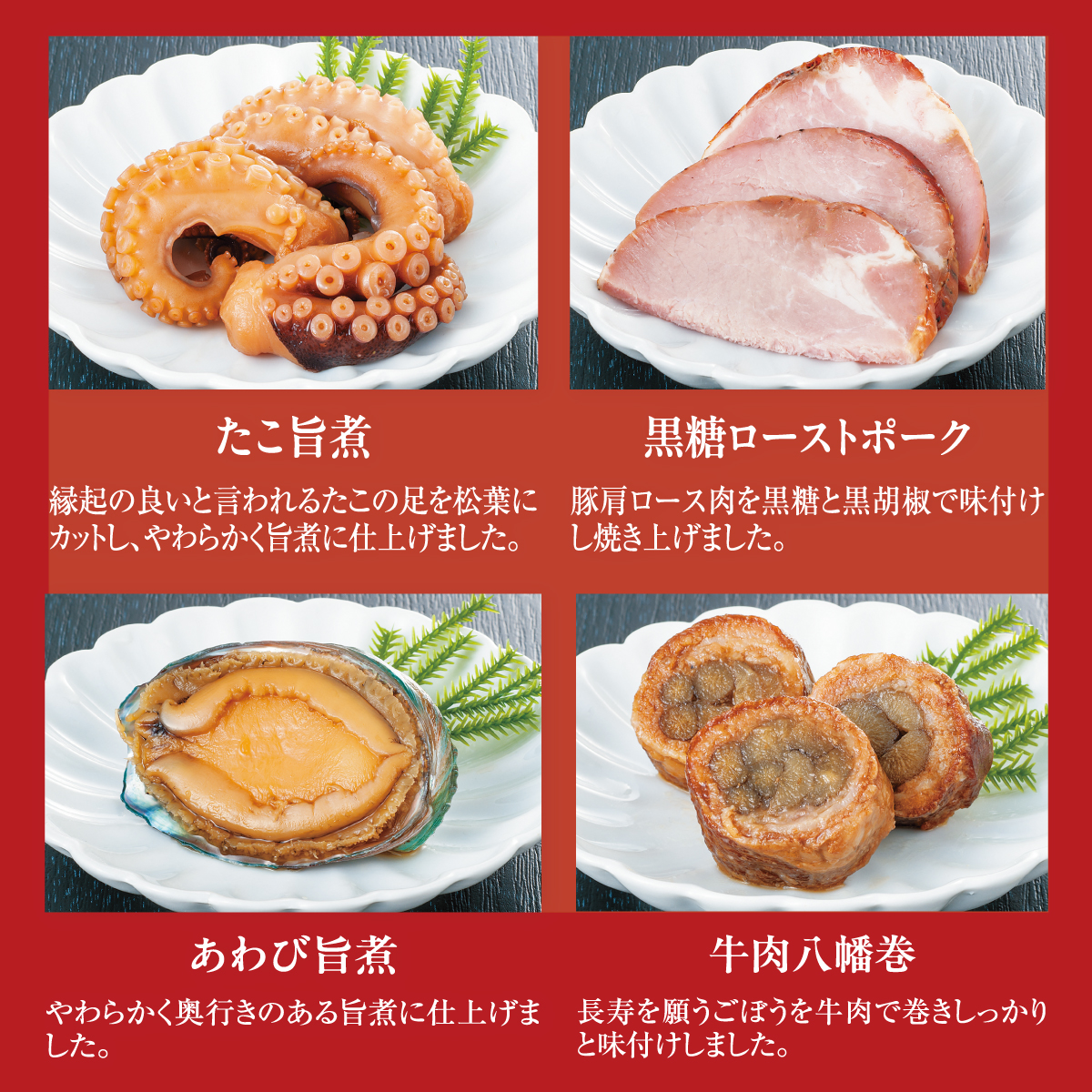 【壱の重】●牛しぐれ笹包み●たたきごぼう●焼たけのこ●椎茸煮●花こんにゃく●一口昆布巻●小鯛俵焼●紅白市松かまぼこ●ばい貝旨煮●彩きぬた●かぶら甘酢漬け●たこ旨煮●あわび旨煮●数の子●海老旨煮●田作り●トラウトサーモン味噌焼【弐の重】伊達巻●花もち紅梅●てまり餅●花もち白梅●黒豆金箔●牛肉八幡巻●若鶏ワイン煮●海老とブロッコリーのテリーヌ●黒糖ローストポーク●鶏ロースチーズ焼●ベーコンチーズドック●ぶり照焼●栗きんとん●いくらなます