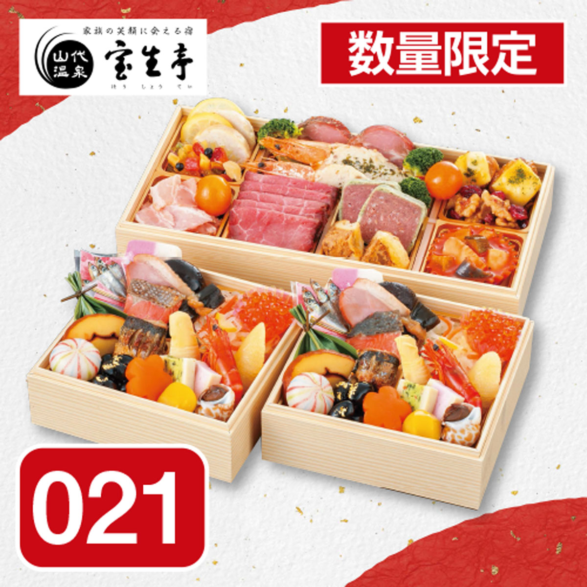 お子様連れや地元の常連客でにぎわう加賀 山代温泉にある温泉旅館です。加賀の四季を伝える地物会席が自慢です。迎春用洋風オードブルとお正月用個食おせちをセットにしました。