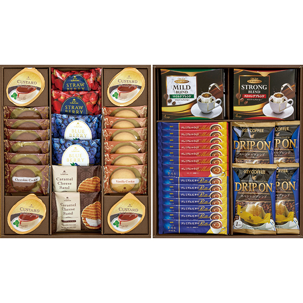 商品規格:ドリップオンスペシャルブレンド8g×4、ハマヤドリップバッグ(マイルドブレンド・ストロングブレンド)各8g×各4、ちょっと贅沢な珈琲店スティックコーヒー(プレミアムビター・プレミアムマイルド)各7g×各7、カスタードプリン65g×4、クッキー(バニラ・チョコレート)×各6、ヴァッフェル(ストロベリー・ブルーベリー・キャラメルチーズ)×各2