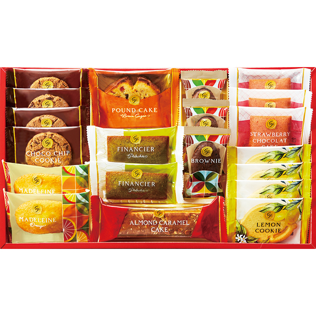 商品規格:チョコチップクッキー・レモンクッキー×各4、ストロベリーショコラケーキ・ブラウニー×各3、オレンジマドレーヌ・ピスタチオフィナンシェ×各2、ブラウンシュガーパウンドケーキ・アーモンドキャラメルケーキ×各1