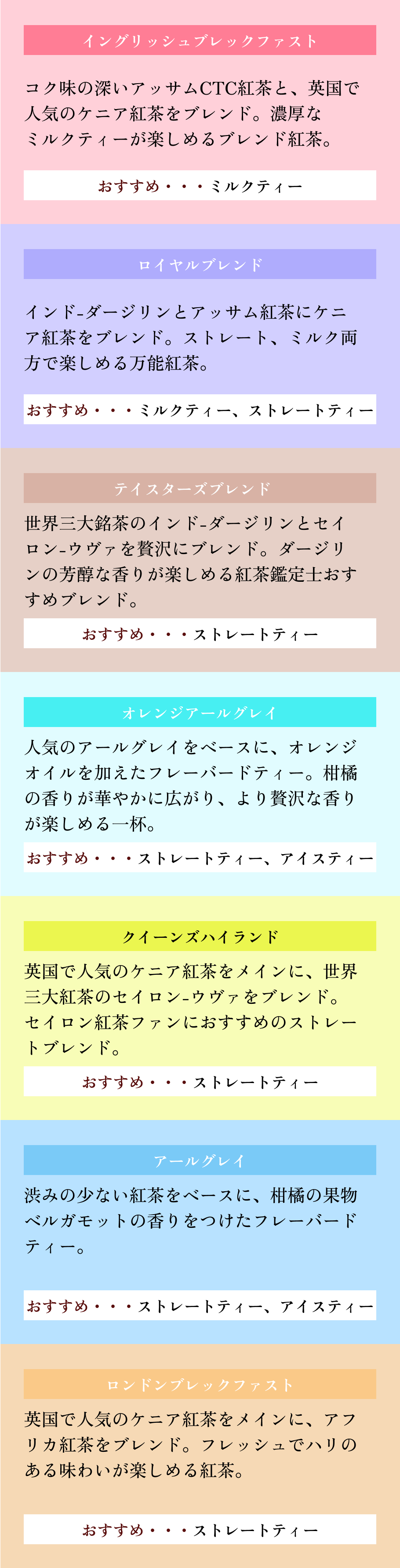 原材料名 | 【イングリッシュブレックファスト】紅茶(インド、ケニア) 【クイーンズハイランド】紅茶(ケニア、スリランカ) 【ロイヤルブレンド】紅茶(インド、ケニア) 【テイスターズブレンド】紅茶(インド、スリランカ) 【ロンドンブレックファスト】紅茶(ケニア、ルワンダ、インド) |