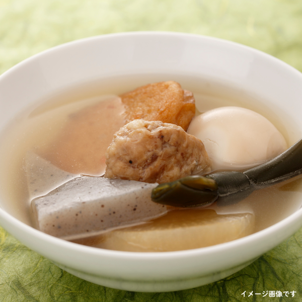 | 原材料名 | スープ[食塩、砂糖、小麦醗酵調味料、醤油、酵母エキス、煮干エキス(いわし)、米醗酵調味料、かつお節エキス、昆布エキス、醸造酢]、大根(国産)、ゆで卵、こんにゃく、野菜揚、牛たんつくね、結び昆布/水酸化カルシウム、調味料(アミノ酸)、リン酸塩(Na)、(一部に卵・小麦・大豆・牛肉・鶏肉を含む) |