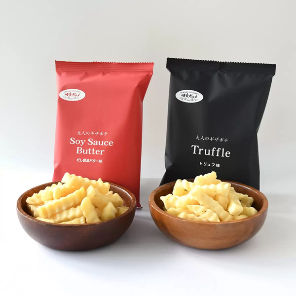 ギザギザにカットしたポテトスティックに2つのフレーバーで味付しました。少し甘めの醤油にバターの風味と味付けとトリュフの風味のアソートです。