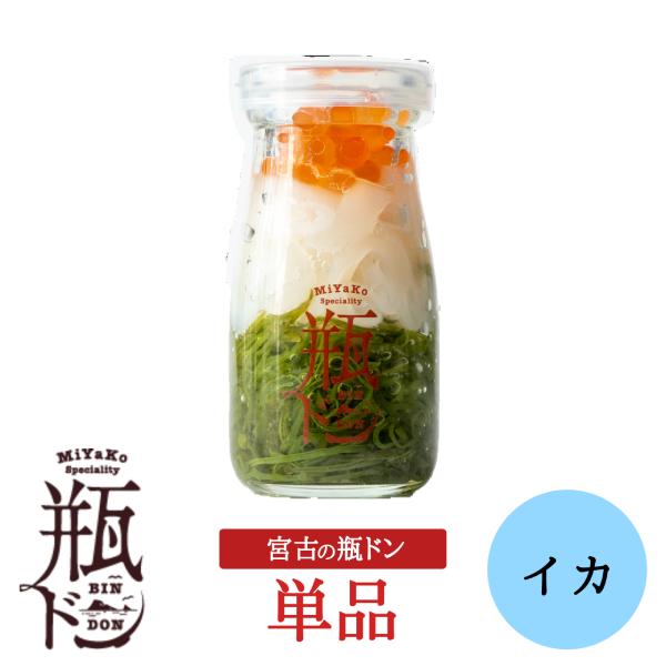 岩手県宮古市の新名物「瓶ドン イカ」単品商品です。三陸が誇る新鮮な海の幸を牛乳瓶にギュッと詰めました。味付きですので、ご飯の上に盛り付けてお召上がりください。
