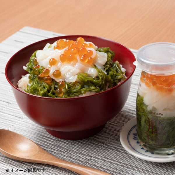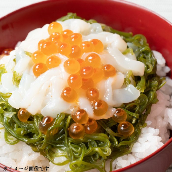 | 原材料名 | イカ(岩手県産)、めかぶ(三陸産)、醤油漬けいくら(鮭卵(国産)、水あめ、醤油、その他)、水あめ、アミノ酸液、清酒、醤油、カツオエキス、たん白加水分解物、酵母エキス/酸味料、増粘多糖類、調味料(アミノ酸等)、トレハロース、(一部に小麦・大豆・いか・いくらを含む) |