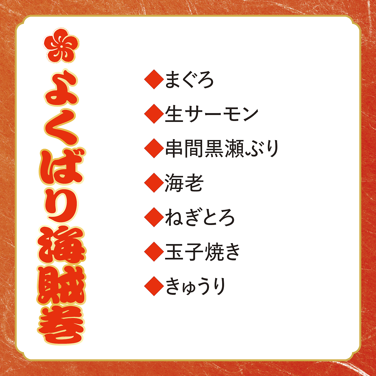 ・まぐろ・生サーモン・串間黒瀬ぶり・海老・ねぎとろ・玉子焼き・きゅうり