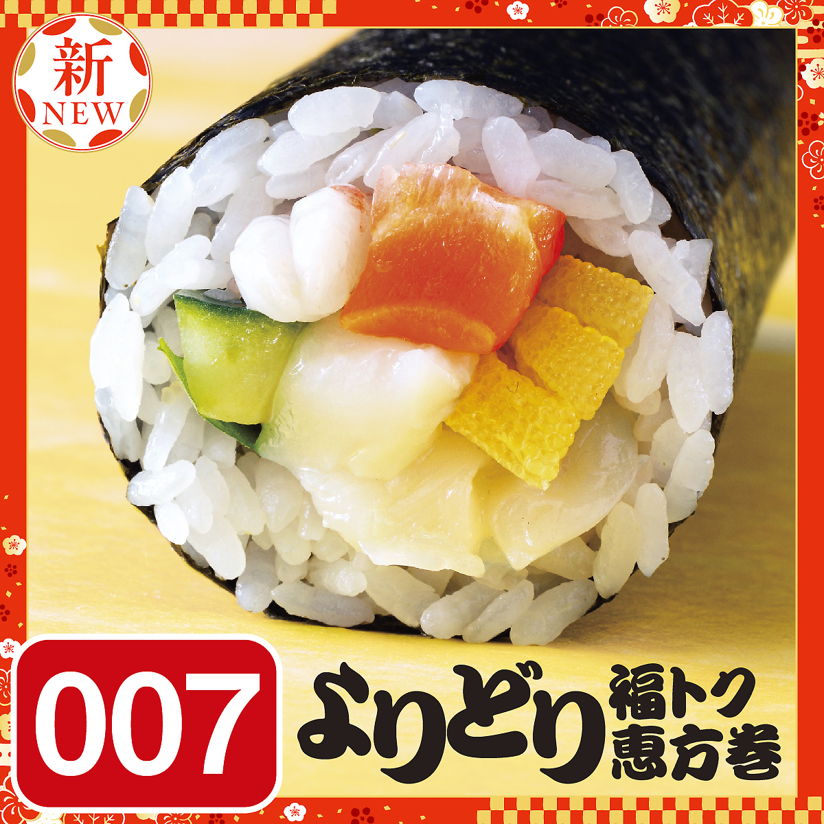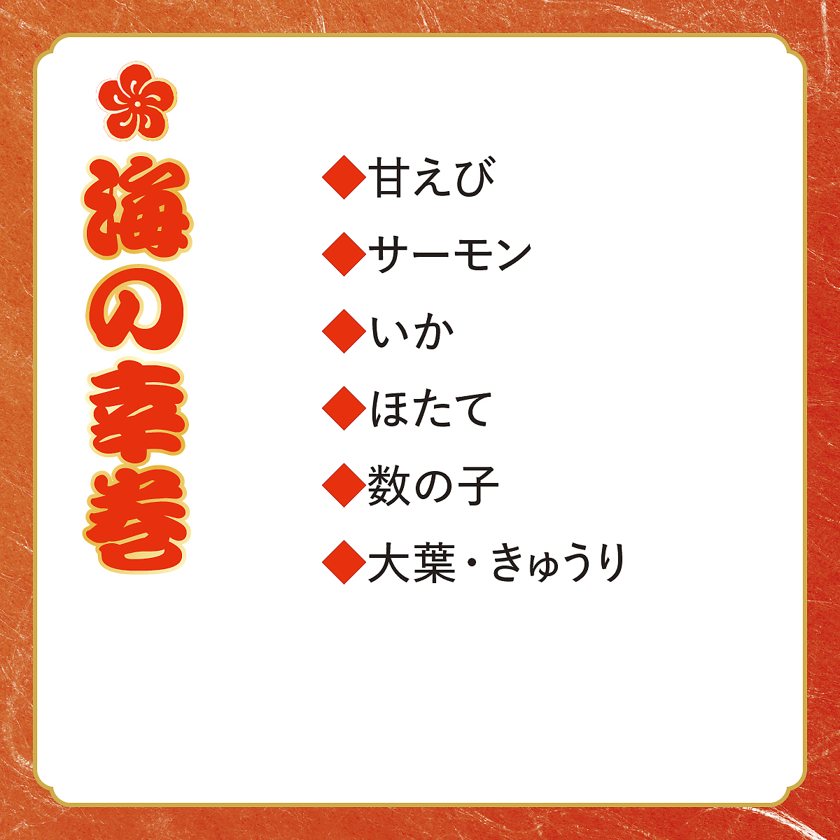 ほたて、えび・いか・サーモン・数の子の5種の海鮮が贅沢に入った巻寿司です。甘トロっとした味わいに数の子のポリポリ食感が楽しい巻寿司です。