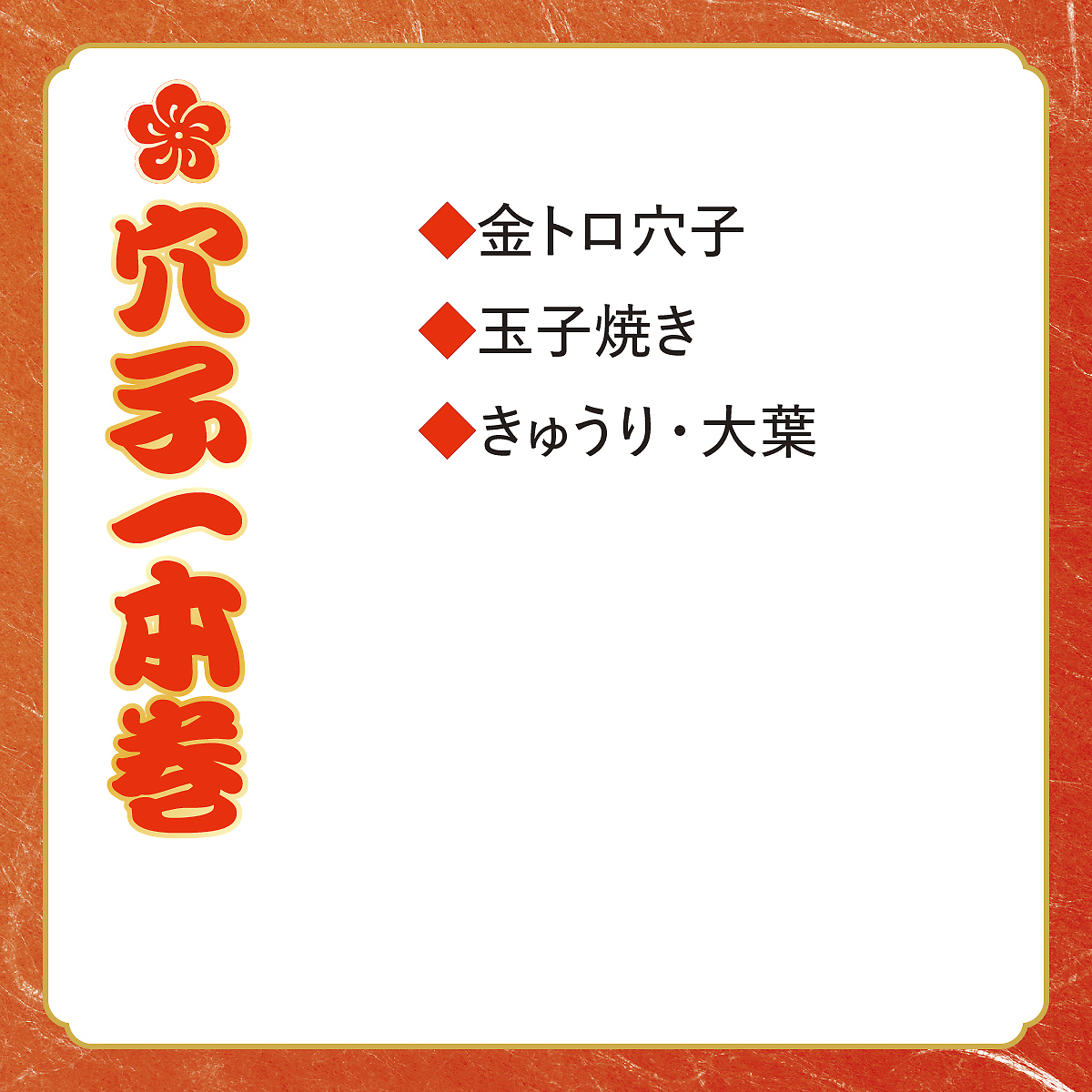 大きな醤油玉子と脂がのった金トロ穴子を1本丸ごと巻いた迫力満点の巻寿司です。