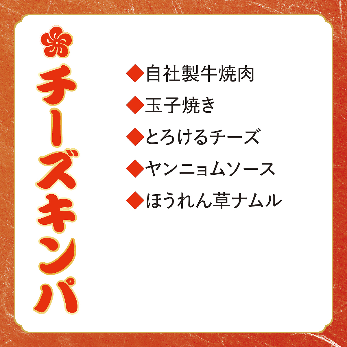 ・自社製牛焼肉・玉子焼き・とろけるチーズ・ヤンニョムソース・ほうれん草ナムル