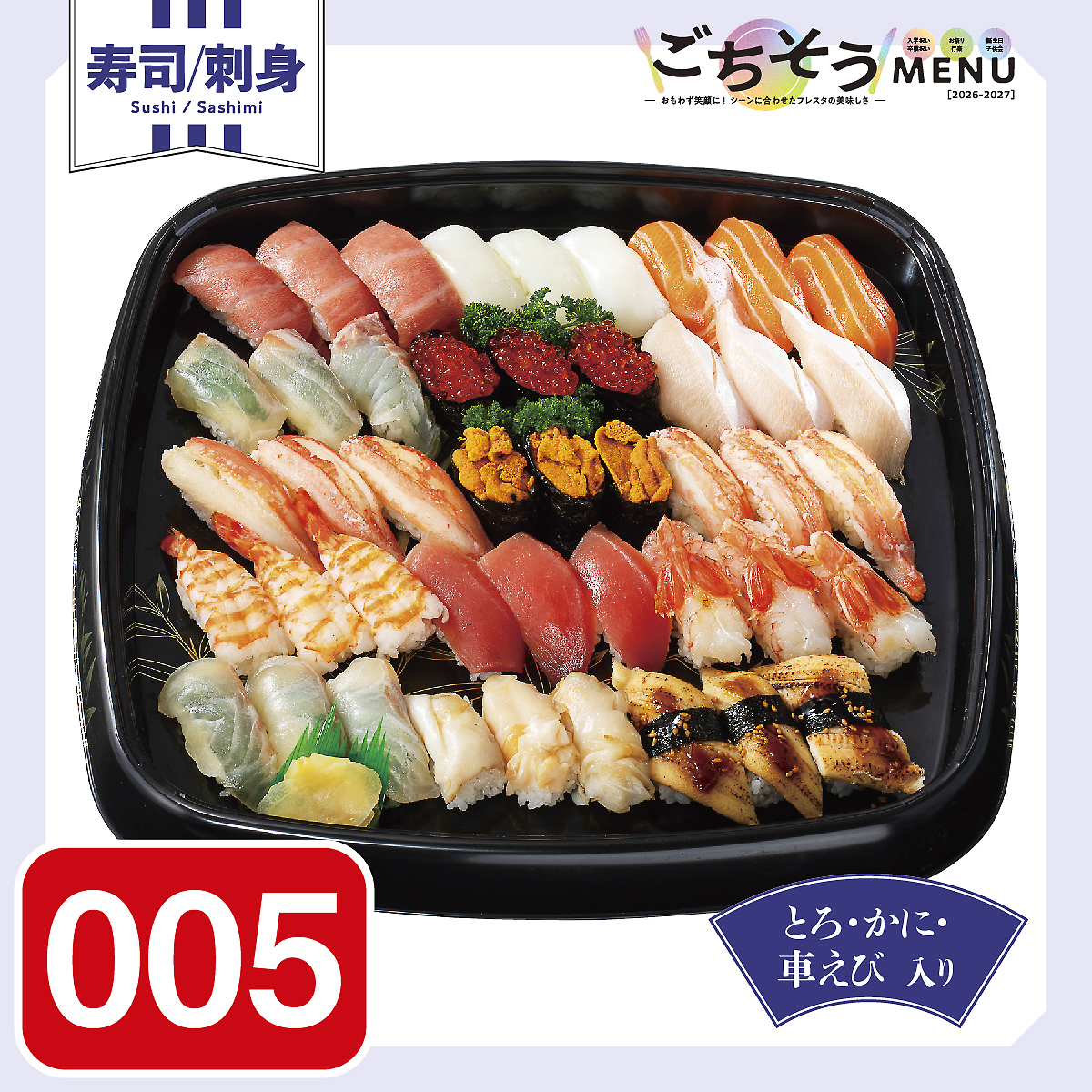 ●本まぐろとろ ●いか ●サーモン ●本鯛●いくら ●ぶり ●かに ●うに ●車えび●まぐろ ●えび ●つぶ貝 ●炙り穴子