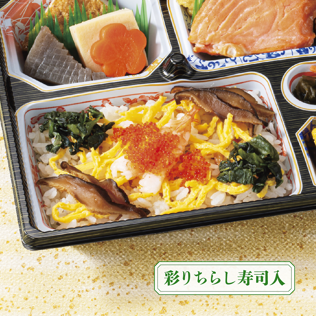 ●具入り酢飯 ●錦糸玉子 ●椎茸煮 ●青菜 ●えび ●とびっこ