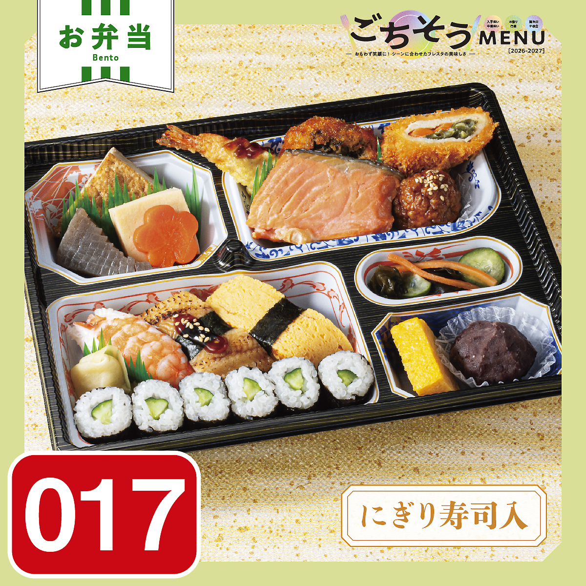 【握り寿司】●えび ●炙り穴子 ●玉子 ●かっぱ巻 【おかず】 ●焼塩鮭 ●海老天 ●椎茸海老詰めフライ ●肉団子 ●玉子焼 ●高野豆腐 ●こんにゃく煮 ●味付け花人参 ●厚揚げ煮 ●酢の物 ●彩り巻きカツ ●自社製ミニおはぎ