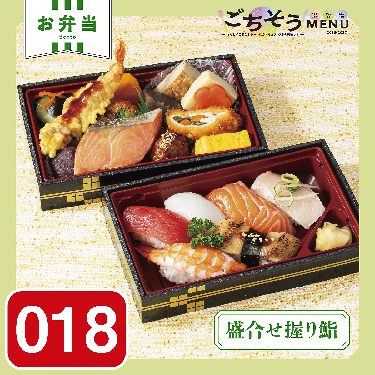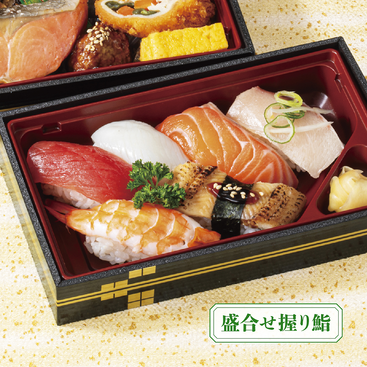 【握り寿司】(わさび抜)●まぐろ ●いか ●サーモン ●ぶり ●えび ●炙り穴子 【おかず】 ●焼塩鮭 ●海老天 ●椎茸海老詰めフライ ●肉団子 ●南瓜煮 ●玉子焼 ●高野豆腐 ●こんにゃく煮 ●味付け花人参 ●厚揚げ煮 ●酢の物 ●彩り巻きカツ ●自社製ミニおはぎ