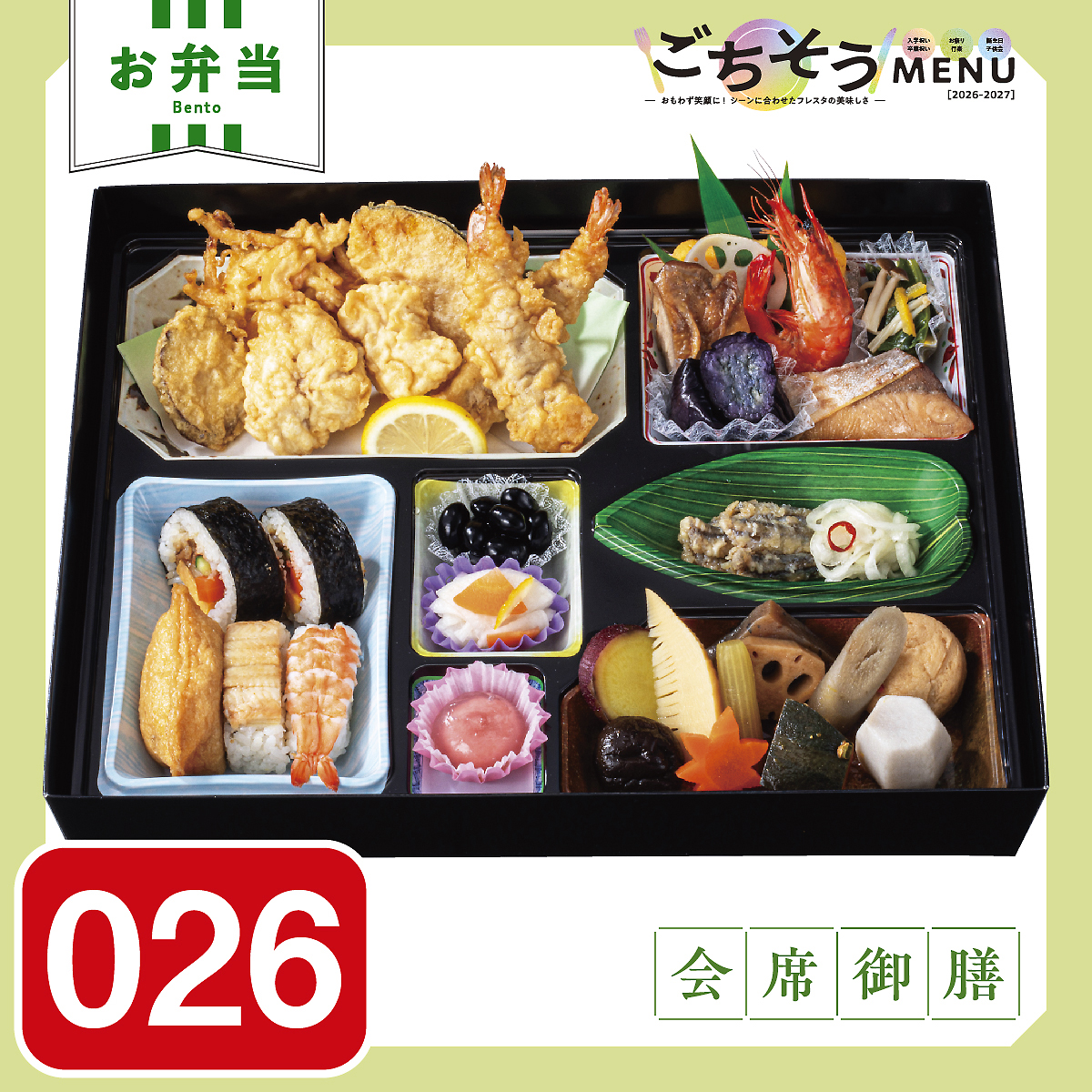 ●巻寿司 ●稲荷寿司 ●煮穴子寿司 ●海老にぎり ●鶏天 ●さつま芋天 ●南瓜天 ●かき揚げ ●海老天 ●出巻玉子 ●酢蓮根 ●鶏照煮 ●茄子の煮浸し ●鰤照焼 ●海老煮 ●小松菜煮浸し ●黒豆煮 ●大根生酢 ●くず梅あん ●小鰯南蛮漬 ●椎茸煮 ●さつま芋煮 ●筍煮 ●南瓜煮 ●蕗の煮物 ●人参煮 ●蓮根煮 ●牛蒡煮 ●蒟蒻煮 ●里芋煮 ●がんも煮冠婚葬祭や地域の集まりに。おもてなし料理を必要とされる方の仕出し弁当。