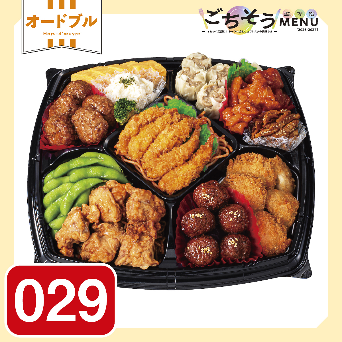 ●ハンバーグ ●出巻玉子 ●ポテトサラダ●ブロッコリー ●しゅうまい ●鶏チリソース ●甘辛牛蒡 ●エビフライ ●スパゲティ●枝豆 ●鶏唐揚 ●焼きそば ●ヒレカツ ●肉団子どんな集まりにも使いやすい、定番のパーティーメニュー。