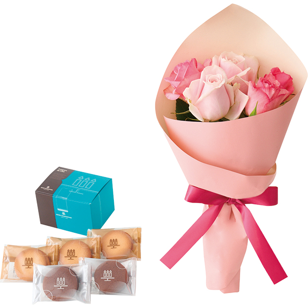 ピンク系のバラを可愛らしいブーケに仕立てました。さっくり食感のクリームサンドクッキー、アンリ・シャルパンティエのラング・ド・シャをセットにしました。