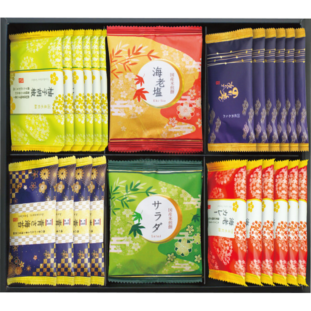 国産米100%にこだわりました。香り高い焼きのりを巻いたのり巻きあられ、磯の香りひろがる青さ煎餅、柚子が香るスパイシーな柚子胡椒煎餅、海老とカレーが癖になる海老カレー煎餅、サクッとソフトなサラダ煎餅、焼き上げた海老が香ばしい厚焼きの海老煎餅の詰合せです。