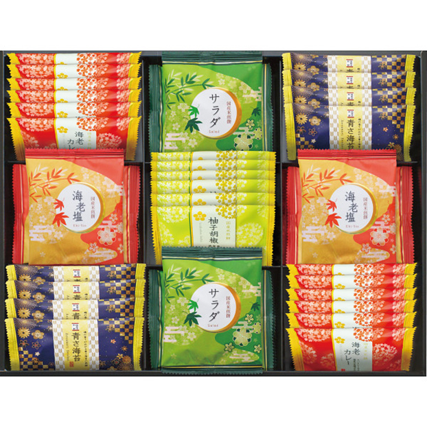 国産米100%にこだわりました。磯の香りひろがる青さ煎餅と、柚子が香るスパイシーな柚子胡椒煎餅、海老とカレーが癖になる海老カレー煎餅、サクッとソフトなサラダ煎餅、焼き上げた海老が香ばしい厚焼きの海老煎餅の詰合せです。