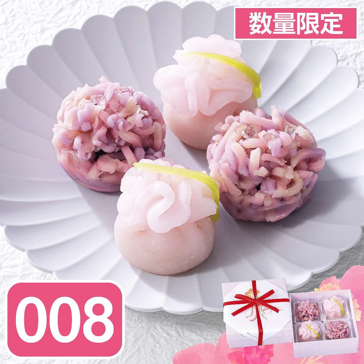 母の日定番のカーネーションを爽やかなレモンあん入りの外郎製で、「家族団らん」の花言葉をもつ紫陽花を御菓子所高木自慢の粒あん入りのきんとん製で表現いたしました。