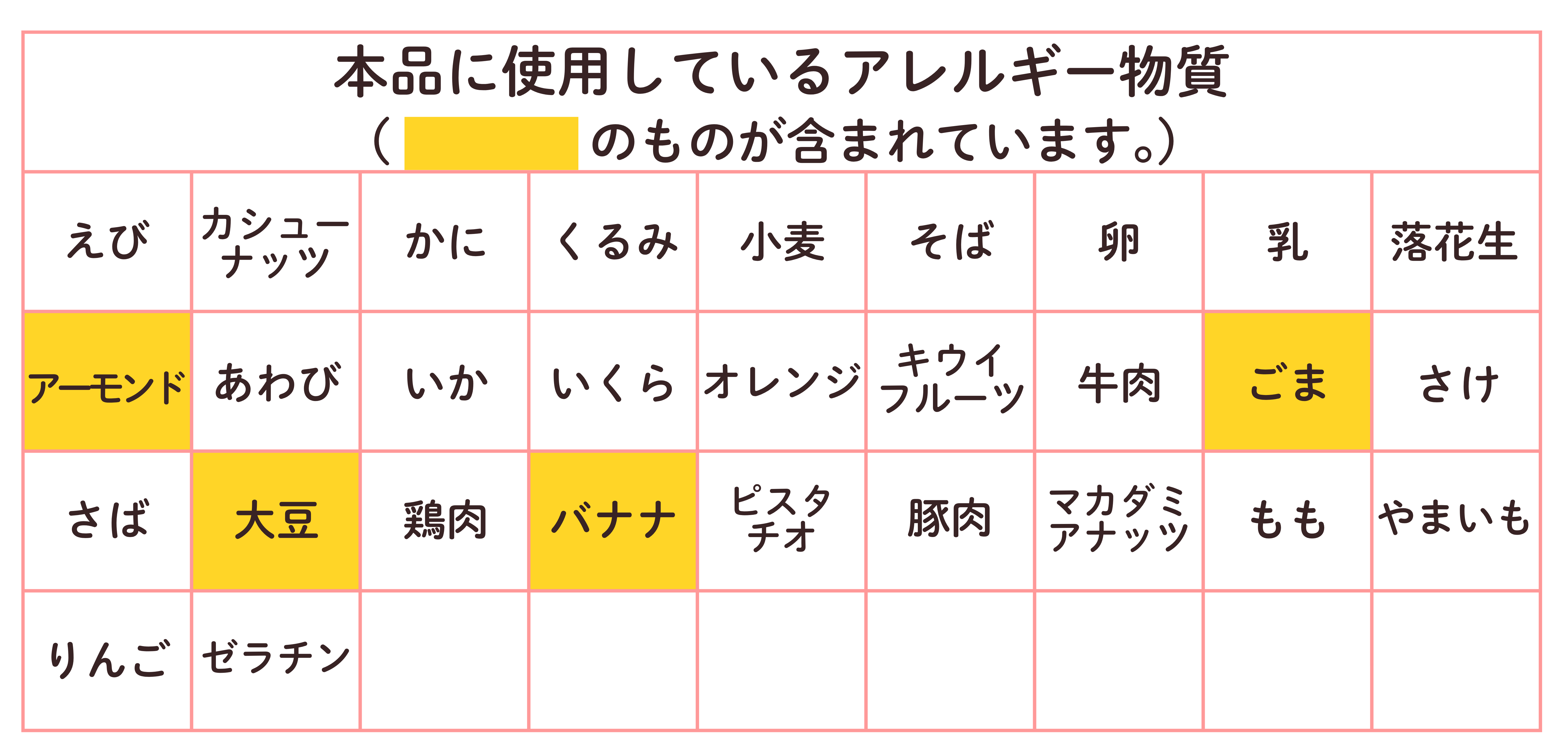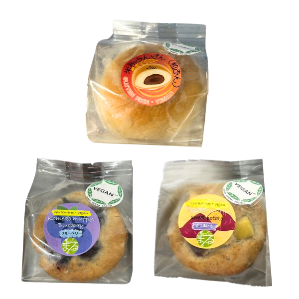 | 原材料名 | 米粉(福岡産)、有機バナナ、豆乳(大豆(国産))、素焚糖(ヴィーガン)、菜種油(平田産業)、アーモンドプードル、有機レモン果汁、蜜漬さつまいも、黒ゴマ、食塩(またいちの塩)/ベーキングパウダー(アルミフリー)、重曹(一部にバナナ、大豆、アーモンド、ごまを含む) |