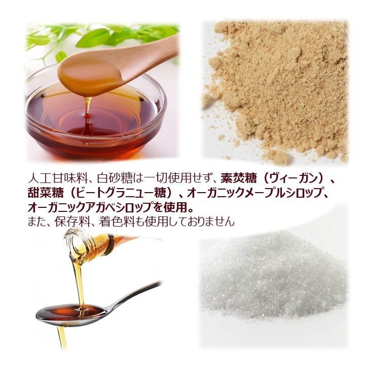 人口甘味料、白砂糖は一切使用せず、素焚糖(ヴィーガン)、甜菜糖(ビートグラニュー糖)、オーガニックメープルシロップ、オーガニックアガベシロップを使用。