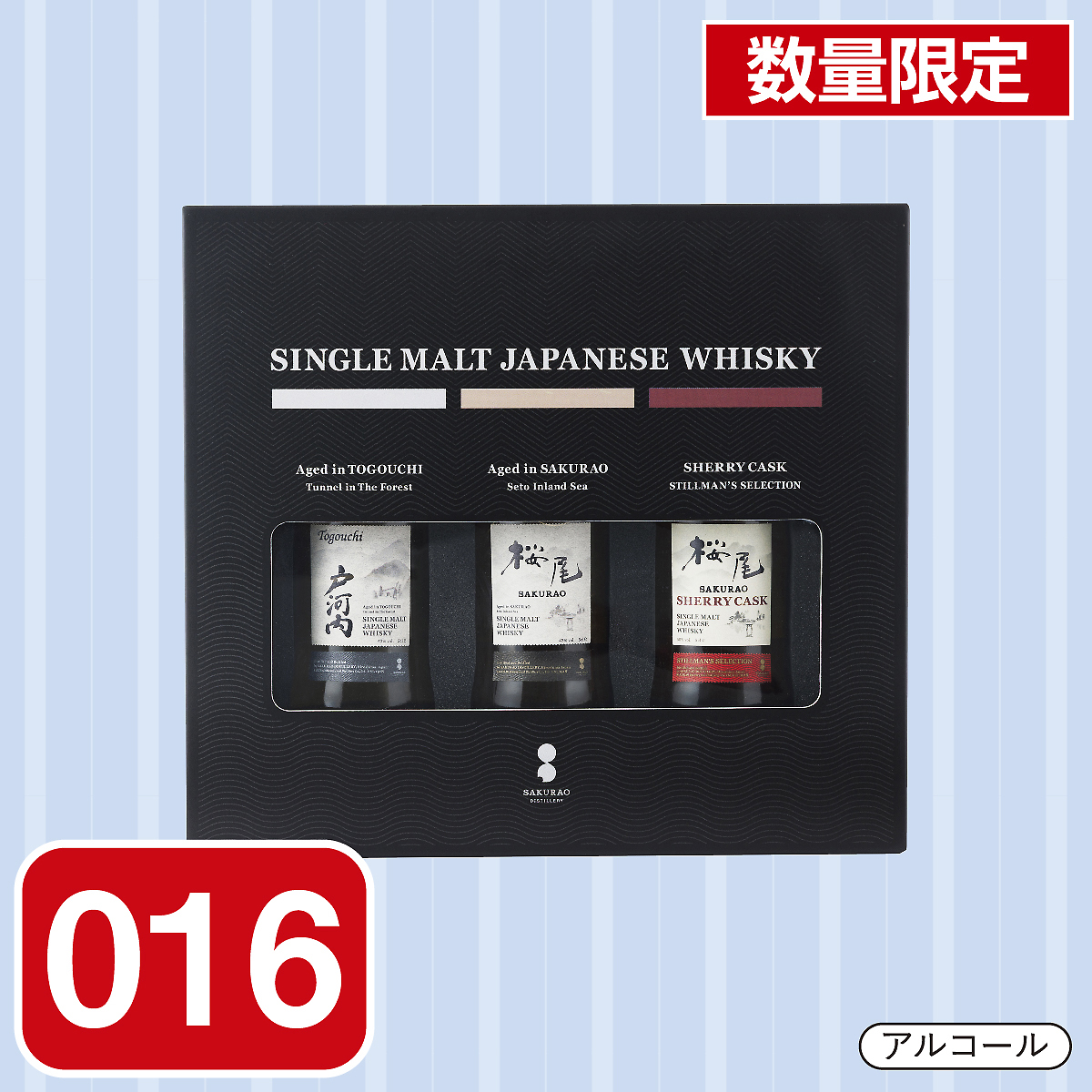 SAKURAO DISTILLERYが製造するシングルモルトジャパニーズウイスキー50mlのミニボトルの3種類セット。桜尾貯蔵庫で熟成したシングルモルトジャパニーズウイスキー桜尾、戸河内貯蔵庫で熟成したシングルモルトジャパニーズウイスキー戸河内、SAKURAO DISTILLERY随一のシェリーカスクを選抜しブレンドしたシングルモルトジャパニーズウイスキー桜尾 SHERRY CASK を50mlのミニボトル3本セットにしました。