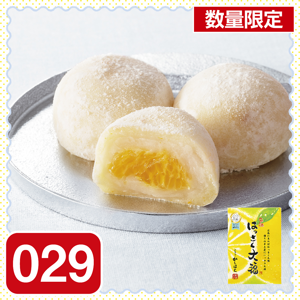 甘酸っぱい八朔の果実と白餡、みかん餅がマッチした大福です。剥いた八朔の果実を内皮となる白あんで包み、それを外皮となるみかん餅で再度包んだ、八朔そのものを表現した商品です。