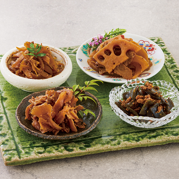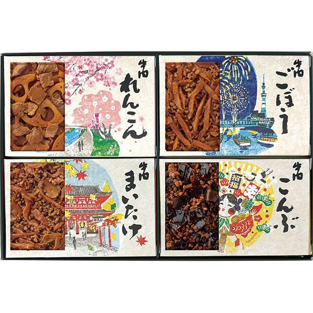 商品規格:牛肉ごぼう・牛肉れんこん・牛肉まいたけ・牛肉こんぶ各55g×各1