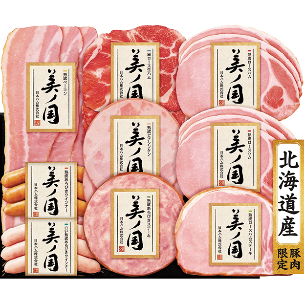 商品規格:熟成ロースハム45g×2、熟成ロースハムステーキ50g、熟成ベーコン48g、肩ロース生ハム30g、熟成ビアシンケン40g、熟成あらびきステーキ47g、熟成あらびきウインナー60g、白い熟成あらびきウインナー60g