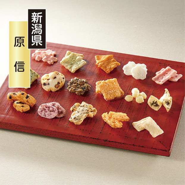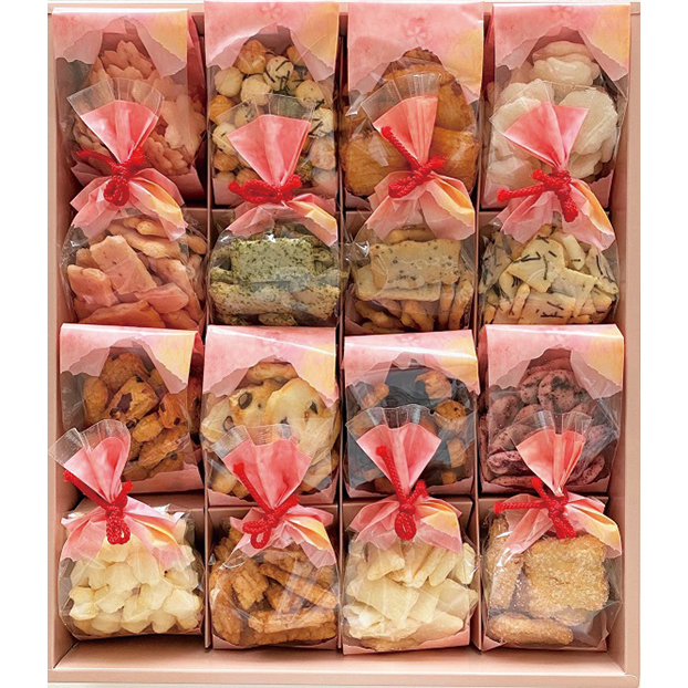 16種類のあられ・おかきの詰め合わせギフト。オリジナル白醤油で味付けしたものや、たっぷりザラメをまぶしたものなどたくさんの味が楽しめる食べ切りパック。
